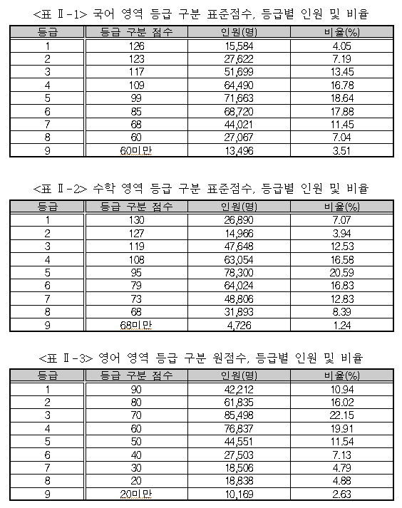 국어와 수학 영역은 평균 100, 표준편차 20, 탐구 영역은 평균 50, 표준편차 10으로 변환한 표준점수가 적용되었다. 영어, 한국사, 제2외국어/한문 영역은 절대평가에 따라 등급만 표기됐다.