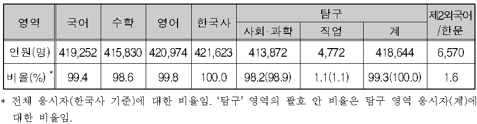 이 중 국어, 수학, 영어 세 영역을 모두 응시한 수험생은 414,596명으로 전체의 98.3%에 달했으며, 국어·수학·영어·탐구 영역까지 모두 응시한 수험생은 412,116명으로 전체의 97.7%를 차지했다.