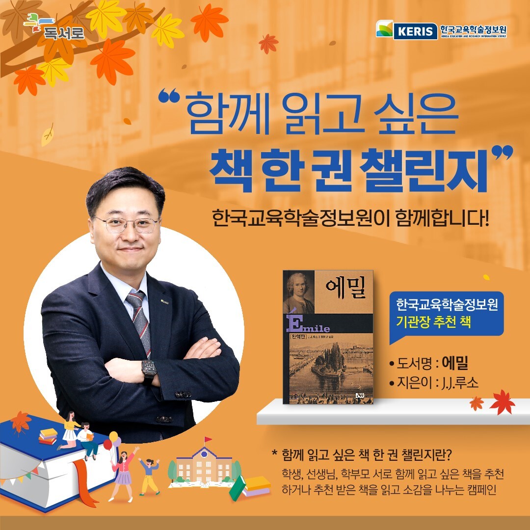 [피앤피뉴스=마성배 기자] 한국교육학술정보원(KERIS, 원장 정제영)은 독서 문화 확산을 위해 오늘(21일)부터 '함께 읽고 싶은 책 한 권' 독서 챌린지를 시작한다. 이 챌린지는 소셜미디어(SNS)를 통해 자신이 추천하고 싶은 책을 소개하고, 추천받은 책을 읽은 후 소감을 나누며 다음 참가자를 지목하는 릴레이 형식으로 진행된다.