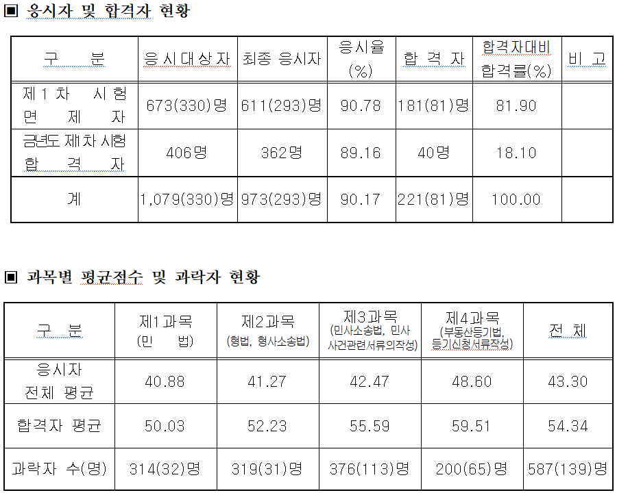과목별 평균 점수는 전체 응시자 기준 민법 40.88점, 형법·형사소송법 41.27점, 민사소송법 및 민사사건 관련서류 작성 42.47점, 부동산등기법 및 등기신청서류 작성 48.60점으로 나타났으며, 전체 평균은 43.30점이었다. 반면 합격자 평균은 전 과목 평균 54.34점으로, 합격선과의 점수 격차가 뚜렷했다.