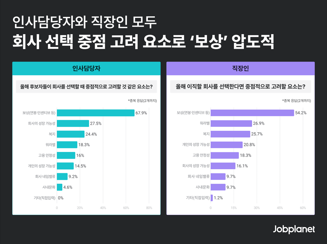 잡플래닛이 인사 담당자 131명과 직장인 1005명을 대상으로 실시한 ‘2025년 HR 트렌드 전망’ 조사에 따르면, 인사 담당자의 67.9%는 보상이 회사 선택의 가장 중요한 요소가 될 것이라고 예상했다. 이어 회사의 성장 가능성(27.5%), 복지(24.4%), 워라밸(18.3%)이 뒤를 이었다.