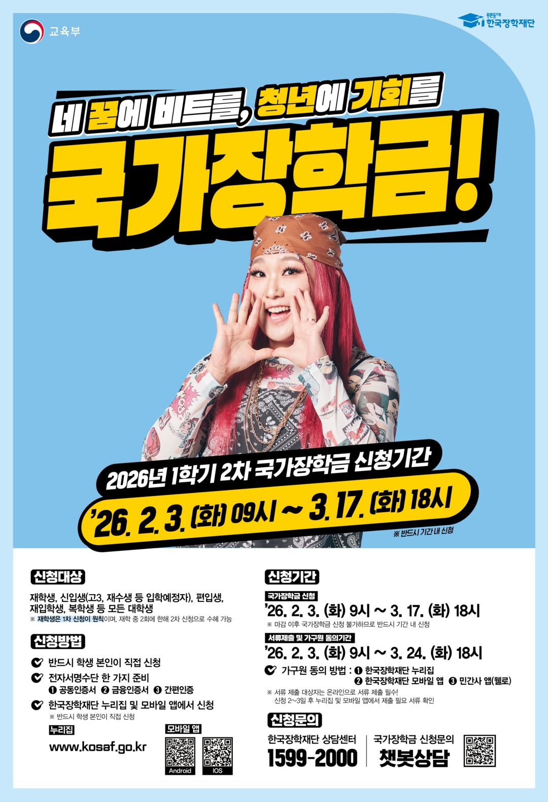 한편 국가장학금을 받기 위해서는 반드시 신청 기간 내 신청이 필요하다. 현재 2026학년도 1학기 국가장학금 2차(최종) 통합 신청이 진행 중으로, 아직 신청하지 않은 학생은 2월 3일부터 3월 17일 오후 6시까지 한국장학재단 누리집과 모바일 앱을 통해 신청해야 한다.