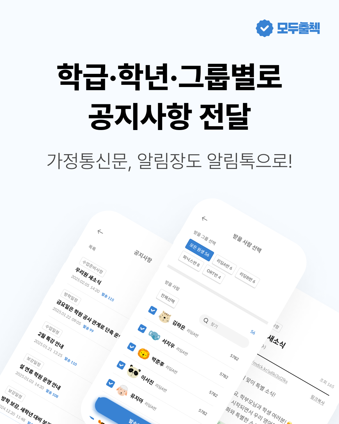 ‘모두출첵’은 학생 등하교 및 수업 출결 상황을 모바일로 실시간 기록하고, 카카오 알림톡 또는 문자메시지로 학부모에게 즉시 전달하는 기능을 제공한다. 또한, 출석부, 수강생 명단 등 교육청 제출용 서류를 자동으로 엑셀 형식으로 출력할 수 있어, 학교 행정 부담을 크게 덜어주는 장점이 있다.