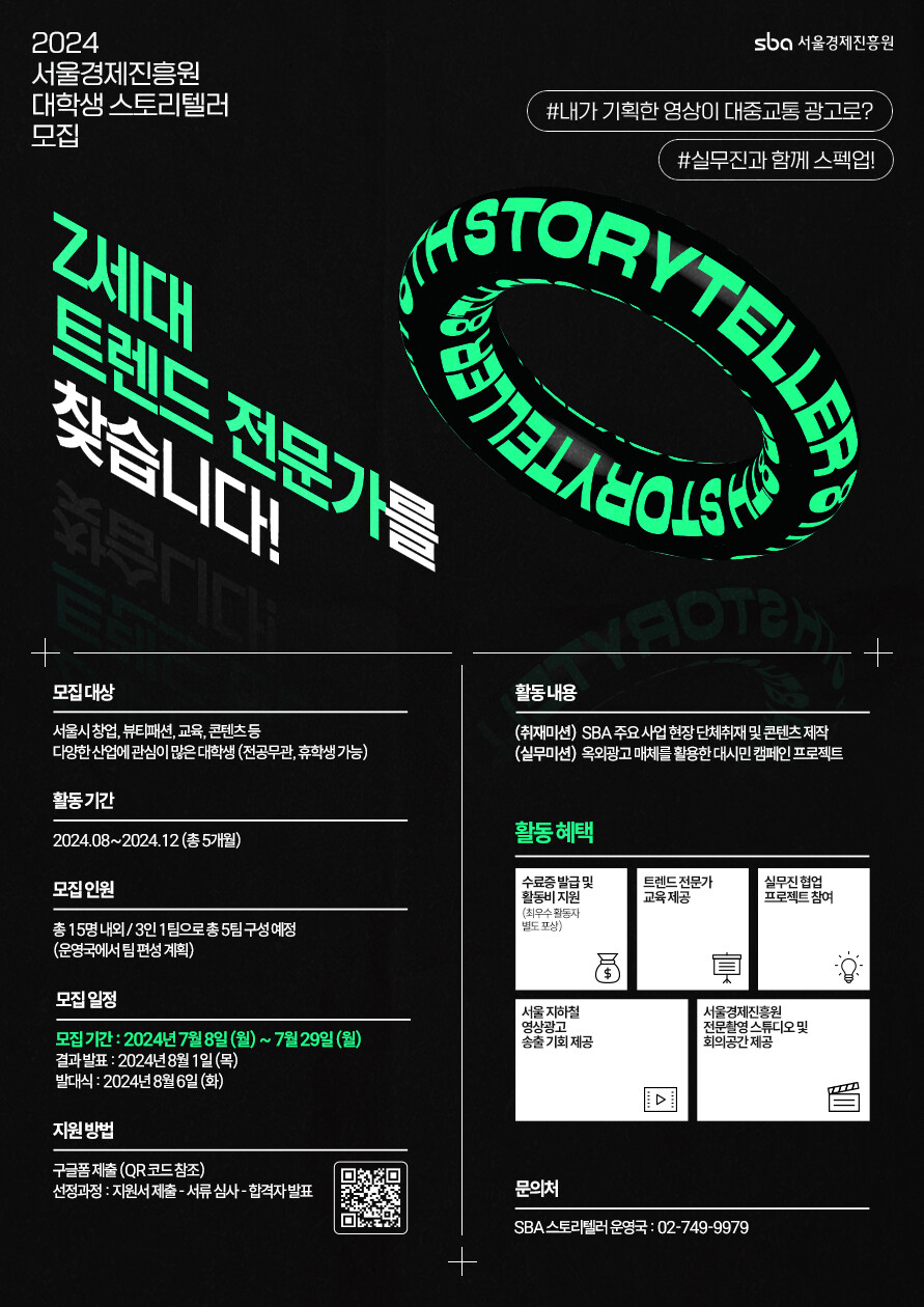 지원은 구글폼 신청 링크를 통해 접수할 수 있으며, 서류 평가를 거쳐 최종 스토리텔러 합격자가 발표될 예정이다. 선발된 인원은 8월 6일(화) 발대식을 시작으로 본격적인 활동을 펼치게 된다.