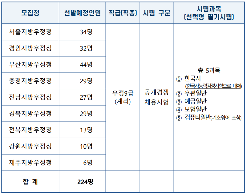 선발 예정 인원은 서울지방우정청 34명을 비롯해 ▲경인지방 32명 ▲부산지방 44명 ▲충청지방 29명 ▲전남지방 27명 ▲경북지방 29명 ▲전북지방 13명 ▲강원지방 10명 ▲제주지방 6명 등 총 224명이다. 사회적 배려 대상자를 위한 장애인과 저소득층 구분모집도 포함되어 있다.