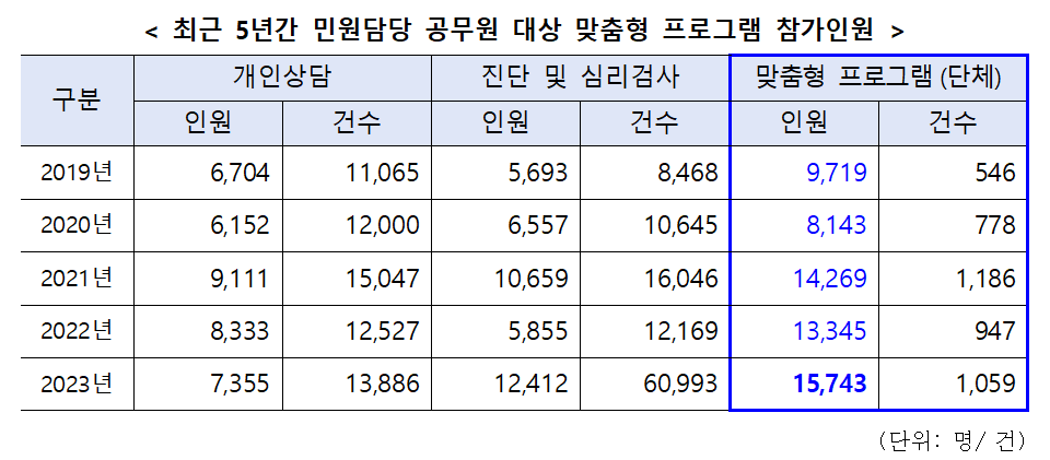 특히, 민원 담당자들을 위한 맞춤형 프로그램은 최근 3년 동안 참가자가 급격히 증가해 2019년보다 1.6배 이상 늘어난 것으로 나타났다.