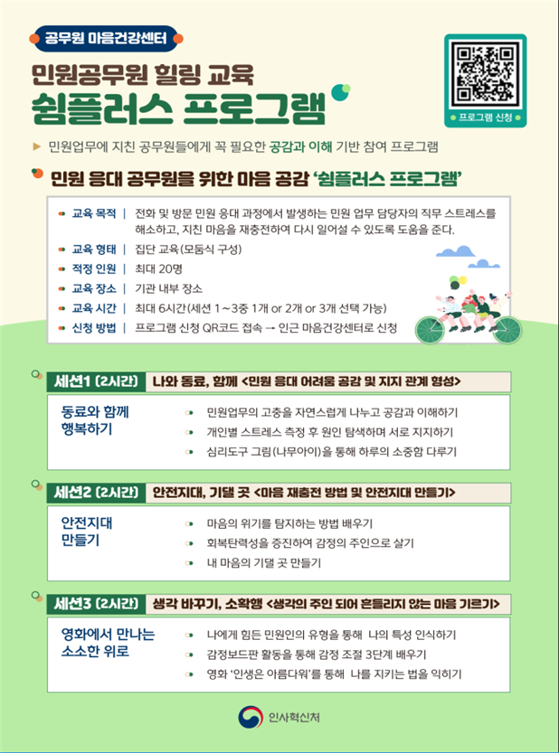 신임 공무원을 위한 ‘마음공감 쉼 함께(투게더)’ 프로그램도 하반기에 지원된다. 이 프로그램은 스트레스 관리와 마음 재충전 방법, 동료와의 소통을 통한 안전지대 만들기 등의 내용을 모둠식으로 운영해 공감과 이해를 바탕으로 한 참여형 프로그램으로 구성된다.