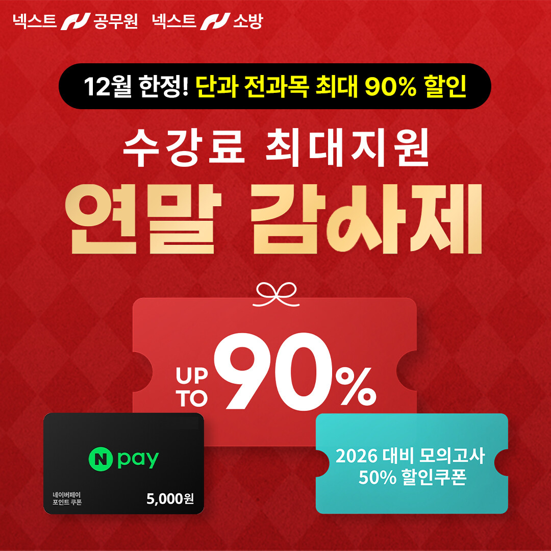 공무원·소방 수험 전문 브랜드 넥스트공무원과 넥스트소방이 2025년에도 함께 해온 수험생들에게 감사와 응원의 마음을 전하고자 12/31(수)까지 단과 강좌 구매 시 최대 90% 수강료를 지원하는 ‘연말 감사제’ 프로모션을 진행한다.