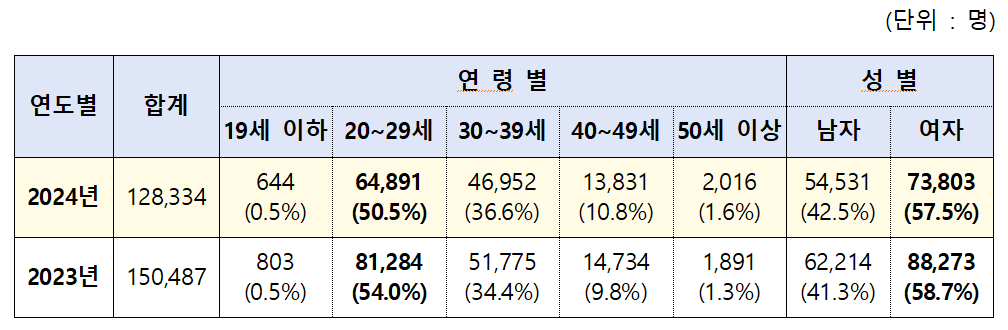 연령별로는 20세~29세가 50.5%(64,891명)로 가장 많은 비율을 차지했으며, 30세~39세가 36.6%(46,952명), 40세 이상이 12.3%(15,847명), 19세 이하가 0.5%(644명)를 차지했다. 특히 50세 이상은 2,016명(1.6%)으로 지난해 1,891명(1.3%)보다 125명 증가했다.