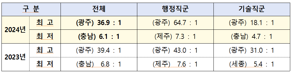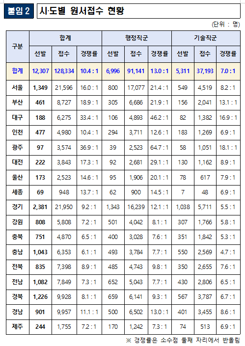 지역별로는 광주가 36.9대 1(선발 97명/접수 3,574명)로 가장 높은 경쟁률을 보였으며, 반면,충남이 6.1대 1(선발 1,043명/접수 6,353명)로 가장 낮은 경쟁률을 기록했다.
