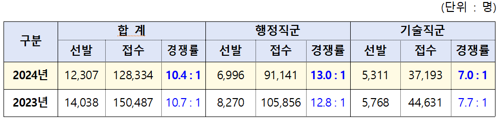 직군별로는 행정직군이 13.0대 1(선발 6,996명/접수 91,141명), 기술직군이 7.0대 1(선발 5,311명/접수 37,193명)의 경쟁률을 기록했다.