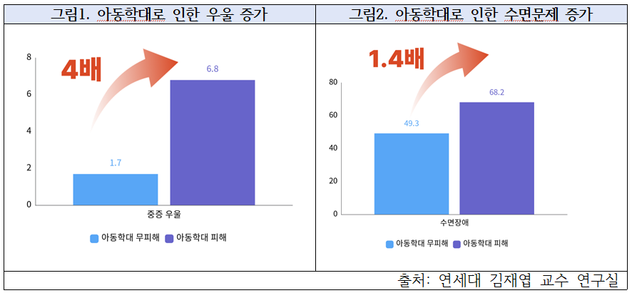 우울 지표는 학대 경험 집단에서 뚜렷하게 높았다. 전체 조사 대상 가운데 중증 우울 수준은 3.3%였지만 학대 경험이 없는 학생은 1.7%, 학대 경험이 있는 학생은 6.8%로 차이가 나타났다. 연구팀은 가정 내 반복되는 긴장과 불안이 정서 상태를 장기간 흔들 수 있다고 설명했다.