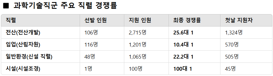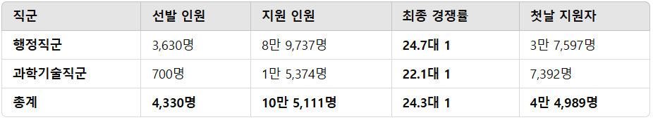 직군별 경쟁률…행정직군 24.7대 1, 과학기술직군 22.1대 1