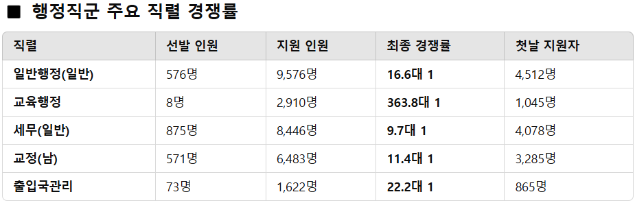 올해 9급 공채에서 가장 높은 경쟁률을 보인 직렬은 ‘교육행정’ 직렬(8명 선발, 2,910명 지원)로 경쟁률 363.8대 1을 기록했다.