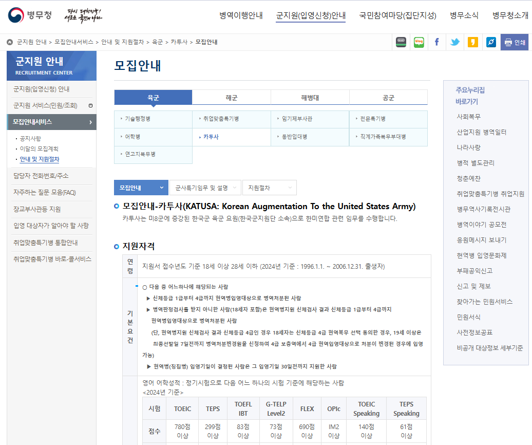 토익스피킹 시험에 대한 자세한 내용은 YBM 어학시험 홈페이지에서, 카투사 모집 공고에 대한 세부 사항은 병무청 사이트에서 확인할 수 있다.