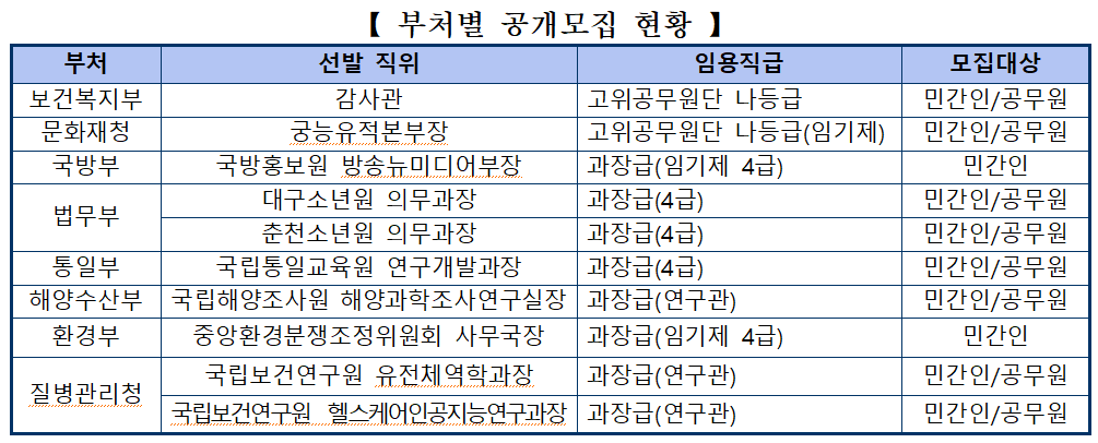 국방부 국방홍보원 방송신매체(뉴미디어)부장과 환경부 중앙환경분쟁조정위원회 사무국장도 공개모집하고, 경력개방형 직위로 민간인재만 지원이 가능하다. 이와 함께 해양수산부 국립해양조사원 해양과학조사연구실장도 과장급 직위로 공개모집한다.