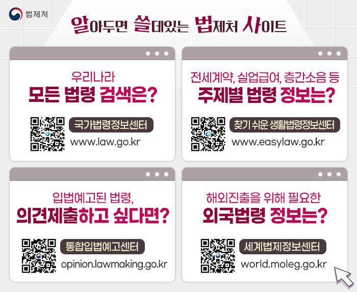 [피앤피뉴스=마성배 기자] 법제처(처장 이완규)는 각종 법령 정보를 국민들이 쉽게 이해하고 활용할 수 있도록 국가법령정보센터, 찾기 쉬운 생활법령정보센터, 통합입법예고센터, 세계법제정보센터를 통해 제공하고 있다고 지난달 30일 밝혔다.