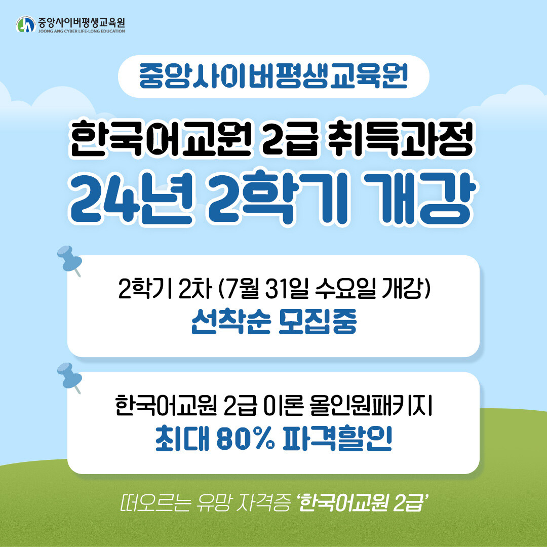 국가평생교육진흥원 평가인정 교육훈련기관인 중앙사이버평생교육원에서는 2024년도 2학기 2차 개강 일정으로 한국어교원 2급 자격증 취득 과정을 모집 중에 있다. 개강일은 7월 31일(수)이며, 수강신청은 개강일 하루 전인 7월 30일(화)까지 가능하다.