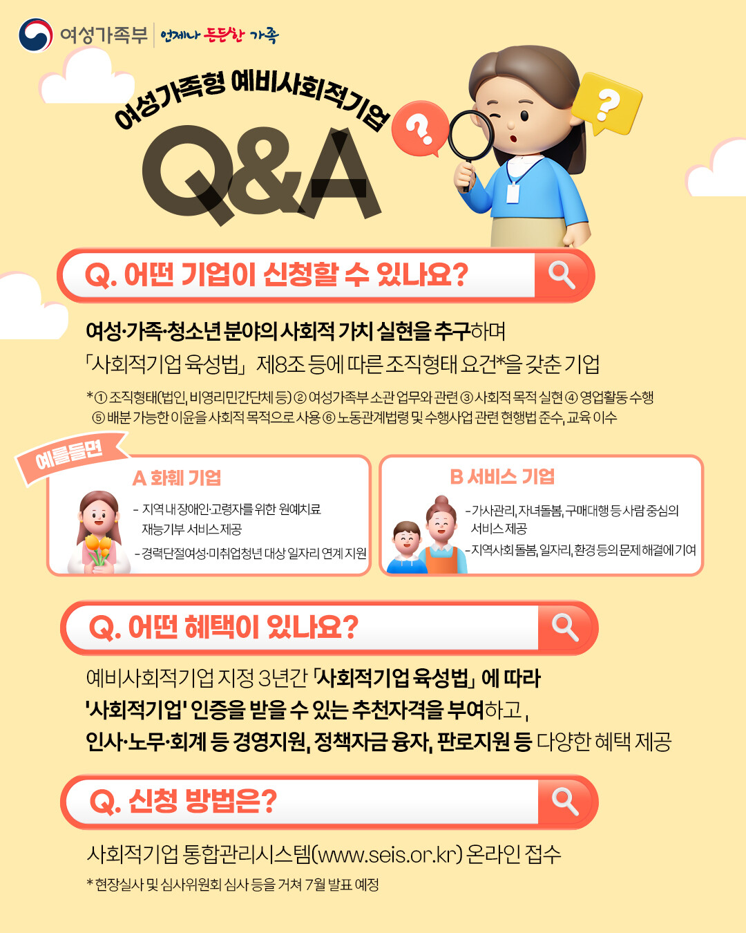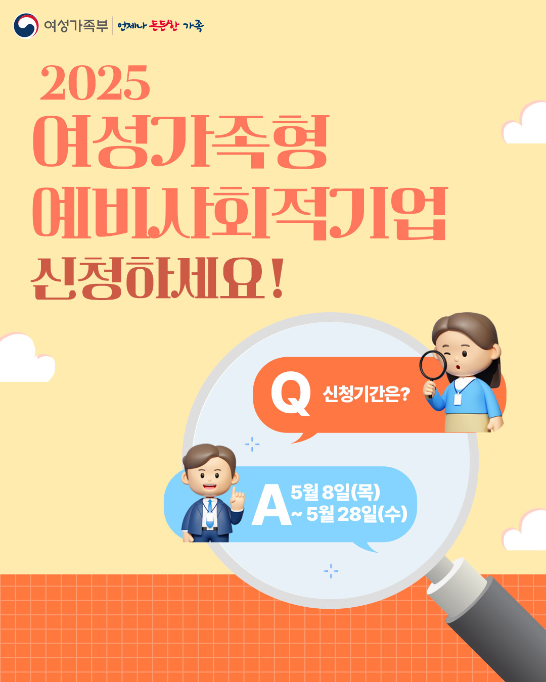 [피앤피뉴스=마성배 기자] 여성·가족·청소년 등 일상과 밀접한 사회 문제를 해결할 예비 사회적기업을 찾는다. 여성가족부는 5월 8일(목) ‘2025년 여성가족형 예비사회적기업 지정·신청’을 공고하고, 이달 28일(수)까지 신청 접수를 진행한다고 밝혔다.
