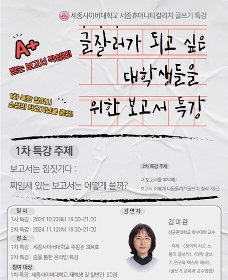 세종사이버대 교양학부 관계자는 “글쓰기 특강을 통해 완벽한 논리 구성과 논리적이고 체계적인 글쓰기 방법 등을 배우며 참석자들의 보고서 글쓰기 능력을 업그레이드할 수 있는 기회를 제공했다”고 설명했다.