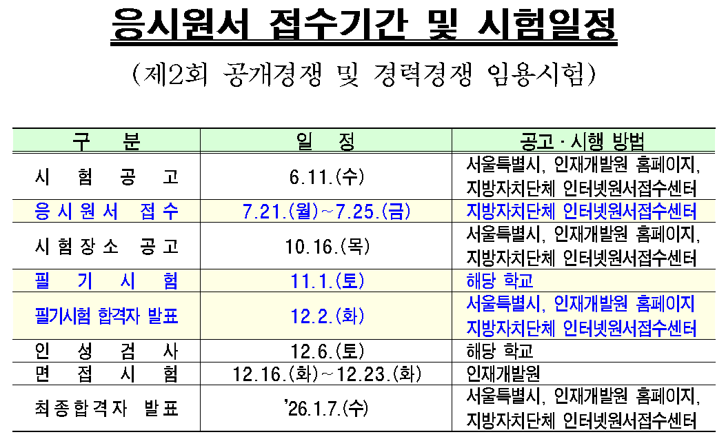 원서접수는 7월 21일(월)부터 25일(금)까지 5일간 지방자치단체 인터넷원서접수센터(local.gosi.go.kr)에서 진행된다. 필기시험은 타 시도와 동일하게 11월 1일(토)에 치러지며, 합격자 발표는 12월 2일(화), 최종합격자는 2026년 1월 7일(수)에 발표된다.