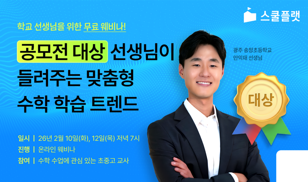 이번 웨비나는 ‘공모전 대상 선생님이 들려주는 맞춤형 수학 학습 트렌드’를 주제로, 교실 안에서 실제로 마주하는 수업 고민을 중심으로 진행된다. 학습 수준 차이가 큰 학급에서의 수업 운영, 기초학력 보완 전략, 수업 자료 준비 부담을 줄이는 방법 등 교사들이 공통으로 겪는 현실적인 고민을 다룬다.