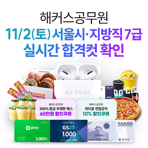 한편, 해커스공무원은 7급 공무원을 준비하는 수험생들을 위해 ‘7급 합격해도 불합격해도 수강료 0원패스’를 제공하고 있다. 7급 공무원 직렬별 전 강좌와 PSAT 전 강좌를 무제한으로 수강할 수 있으며, 합격해도 불합격해도 수강료를 100% 현급 환급해준다. (*미션 달성 시, 교재비/강의옵션 환급 대상 제외, 제세공과금 본인부담)