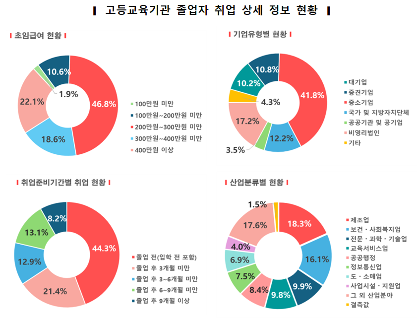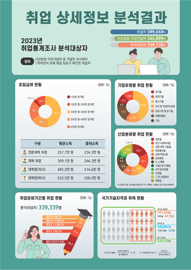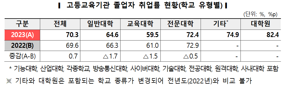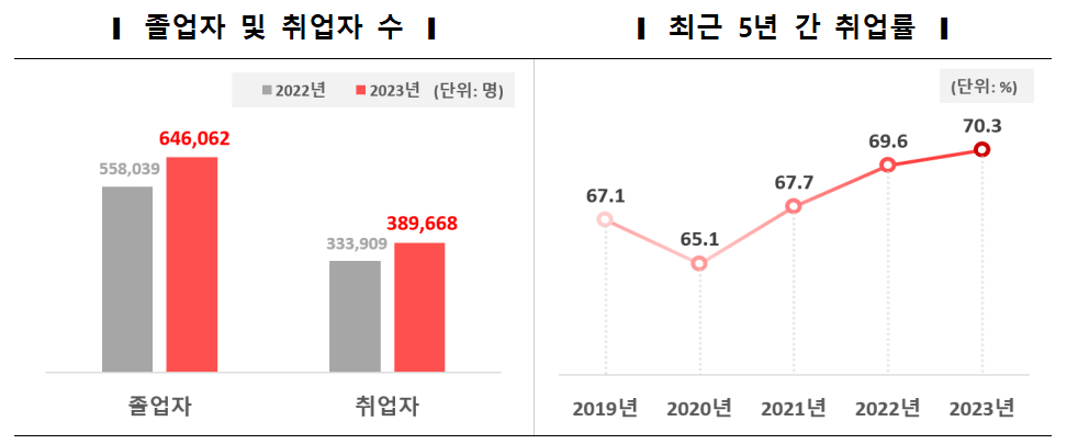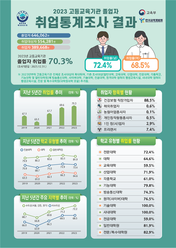 교육부와 한국교육개발원이 발표한 ‘2023년 고등교육기관 졸업자 취업통계조사’에 따르면, 2023년 2월과 2022년 8월 졸업자를 대상으로 조사된 결과, 고등교육기관 졸업자 중 취업자는 38만 9,668명으로 전체 취업 대상자의 70.3%가 취업에 성공했다. 이는 전년 대비 0.7%p 상승한 수치다.