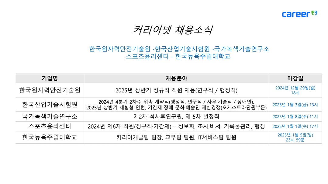 [피앤피뉴스=마성배 기자] 연말을 맞아 주요 공공기관들이 대규모 채용을 진행한다. 한국원자력안전기술원, 한국산업기술시험원, 국가녹색기술연구소, 스포츠윤리센터, 한국뉴욕주립대학교 등 다섯 곳이 정규직, 계약직, 인턴직 등을 포함한 다양한 직군에서 인재를 모집 중이다.