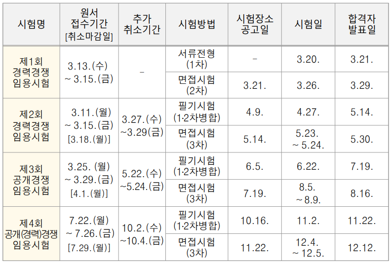 8·9급 공개경쟁임용시험의 응시원서 접수는 3월 25일(월)부터 29일(금)까지 진행되며, 필기시험을 6월 22일(토) 시행하여 합격자를 7월 19일 발표한다. 면접시험을 8월 5일부터 9일까지 실시한 후 최종합격자를 8월 16일 확정한다.