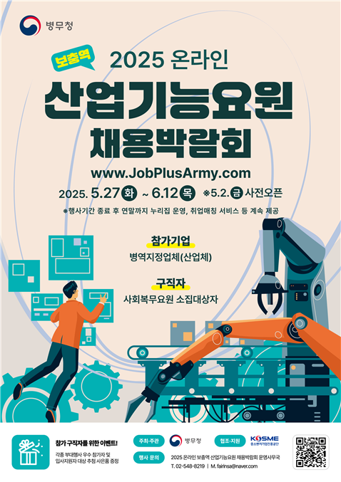 병무청은 5월 27일부터 6월 12일까지 총 17일간 ‘온라인 보충역 산업기능요원 채용박람회’를 개최한다고 밝혔다. 이번 박람회는 제조·생산 인력으로 산업현장에서 복무할 병역지정업체와 병역의무 대상 청년들을 연결해주는 공익 행사다.