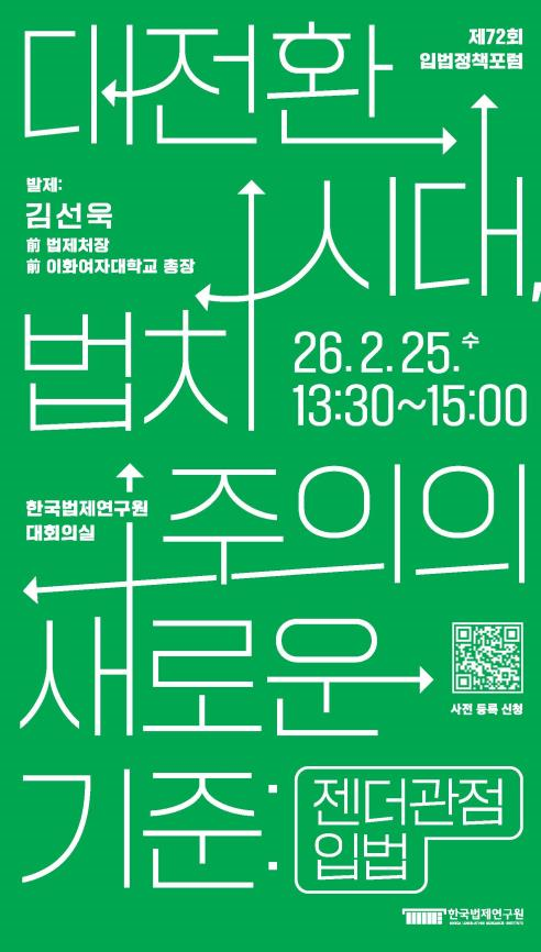 [피앤피뉴스=마성배 기자] 한국법제연구원은 25일 오후 1시 30분 연구원 대회의실에서 제72회 입법정책포럼을 열고, 「대전환시대, 법치주의의 새로운 기준: 젠더관점입법」을 주제로 논의를 진행한다. 이날 포럼에는 김선욱 이화여자대학교 법학전문대학원 명예교수가 발제자로 나선다.