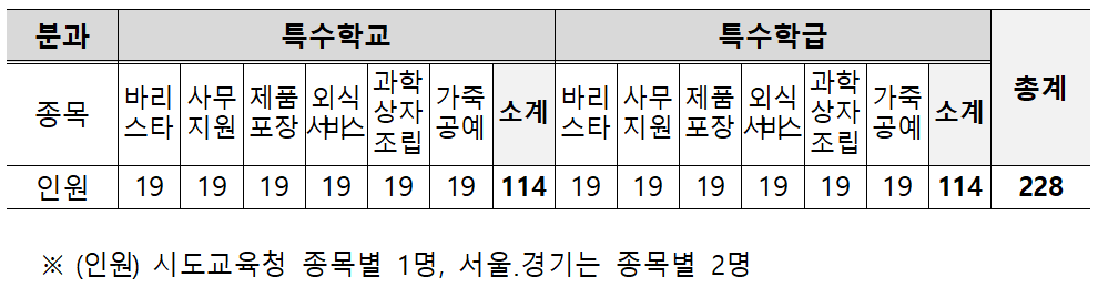 특수학교와 특수학급 두 분과로 나누어 진행되며, 학생들의 흥미와 진로를 고려해 학교 교육과정과 연계될 수 있도록 구성됐다. 각 분과별로 바리스타, 사무지원, 제품포장, 외식서비스, 과학상자조립, 가죽공예 등 6개 종목에서 경연이 펼쳐진다.