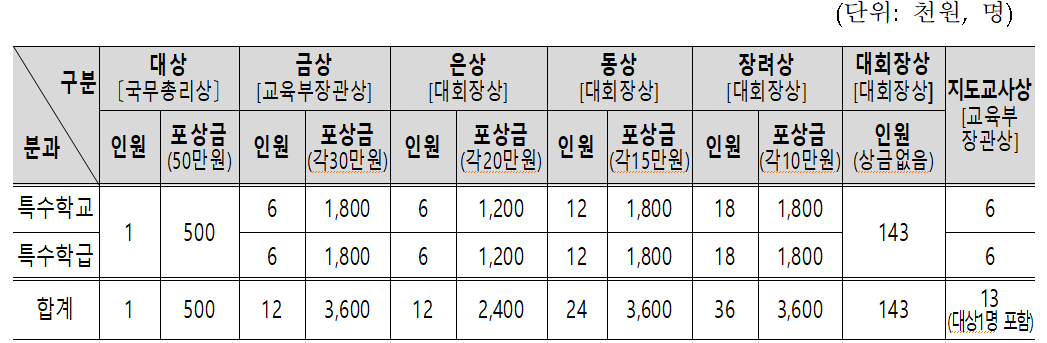 시상...대상(1명), 금·은상(분과별 각 6명), 동상(분과별 12명), 장려상(분과별 18명)