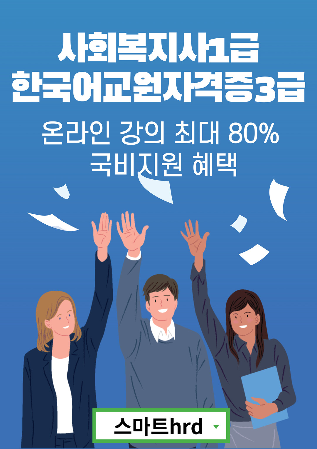 한편 스마트hrd뉴엠은 한국어교원자격증3급, 사회복지사1급 자격증 이외에도 경비지도사, 전기기능사(전기산업기사/전기기사), 직업상담사2급, 물류관리사, 손해사정사, 주택관리사, 행정사, 수산물품질관리사, 농산물품질관리사, 관광통역안내사 등 다양한 국가자격증을 최대 60~80% 국비지원으로 운영하고 있다.