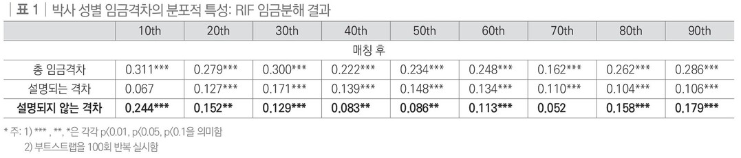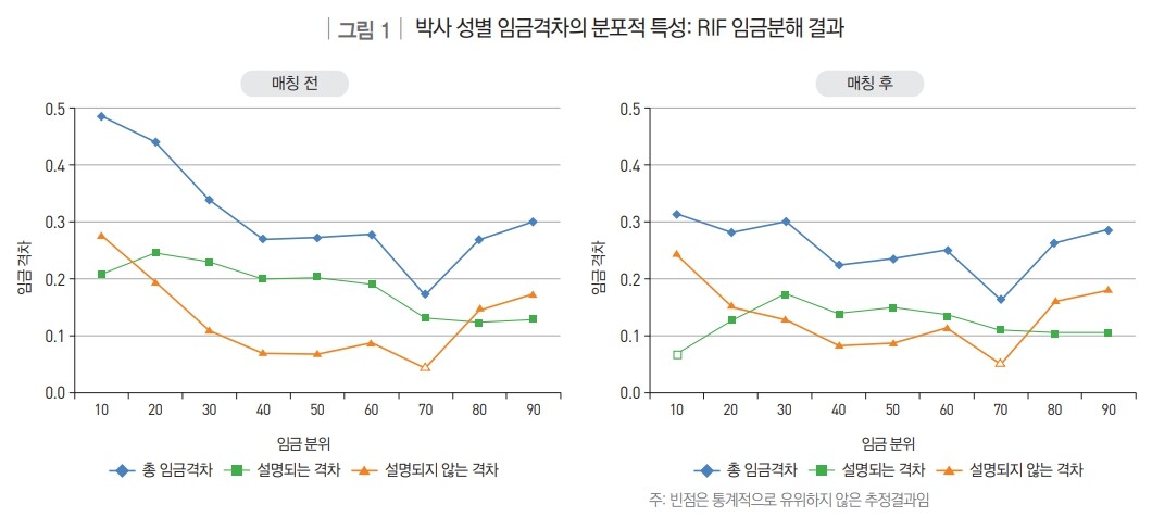 박사학위 보유자 간 성별 임금 격차를 최하위(10분위)부터 최고위(90분위)까지 분석한 결과, 중분위보단 양극단(저분위 혹은 고분위)으로 갈수록 설명되는 격차(교육/경력/생산성 차이 등에서 발생하는 임금 격차)보다 이로는 설명되지 않는 차별이 많은 것으로 분석됐다.