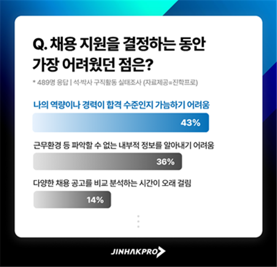 진학프로가 석·박사 지원자 489명을 대상으로 진행한 설문조사에 따르면, 응답자의 43.1%가 “내 역량·경력이 합격 수준인지 알기 어렵다”고 답했고, 35.8%는 ‘채용 시장의 내부 정보를 알기 어렵다’고 밝혔다.