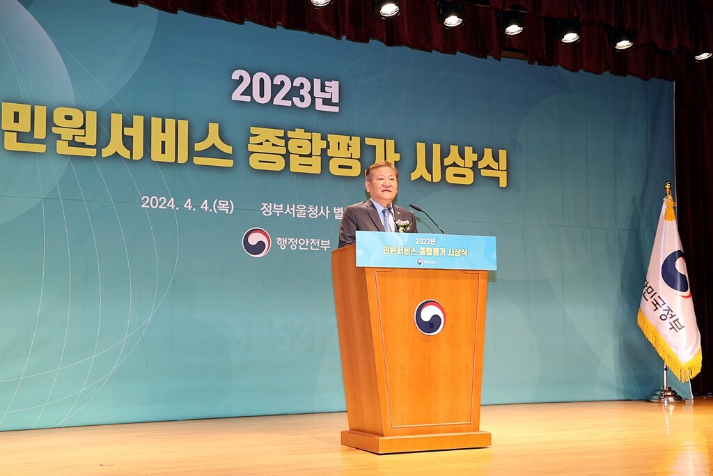 <이상민 행정안전부 장관이 지난 4월 4일 오후 서울시 종로구 정부서울청사 별관 대강당에서 열린 민원서비스 종합평가 시상식에서 인사말을 하고 있다. 사진=행정안전부>