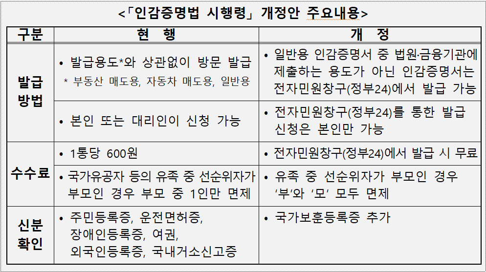 한편, 인감증명서 발급 신청 시 본인확인을 위한 신분증으로 국가보훈등록증이 추가되며, 발급 수수료 면제 대상도 확대된다. 인감증명서 발급 수수료(1통당 600원)를 국가유공자 등의 부모 중 1명에게만 면제하던 것을 부모 모두에게 적용하고, 정부24에서 발급받는 경우에도 무료로 발급된다.