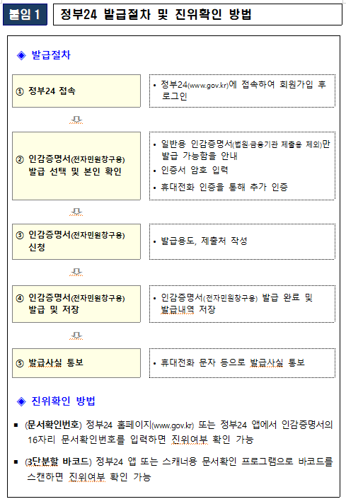 특히, 온라인 발급된 인감증명서의 위변조를 방지하기 위한 검증장치도 도입됐다. 사용자는 정부24 홈페이지나 앱에서 인감증명서 상단에 있는 16자리 문서확인번호를 입력하면 진위여부를 확인할 수 있고, 정부24 앱 또는 스캐너용 문서확인 프로그램으로 바코드를 스캔하여 진위 여부를 확인할 수 있도록 3단 분할 바코드가 도입된다.