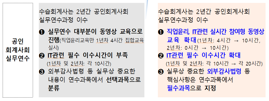또한, 공인회계사회 실무연수에서는 IT 관련 필수 이수시간을 단계적으로 확대하고(1, 2년간 각 10시간 → 각 20시간), 외부감사법령, 자본시장법령 등 주요 과목을 필수과목으로 지정할 예정이다.