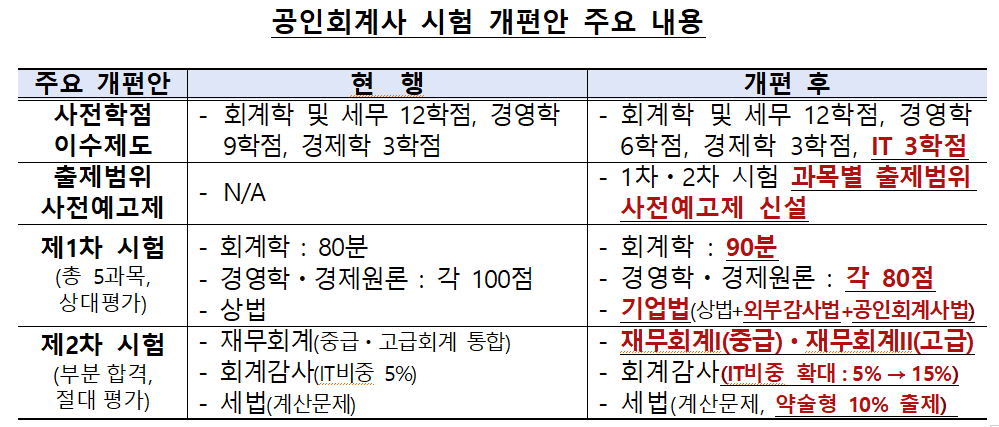이번 개편안 주요 내용은 IT 사전학점 이수제도 도입, 출제범위 사전예고제 신설, 1차 및 2차 시험 과목 변경 등이다.
