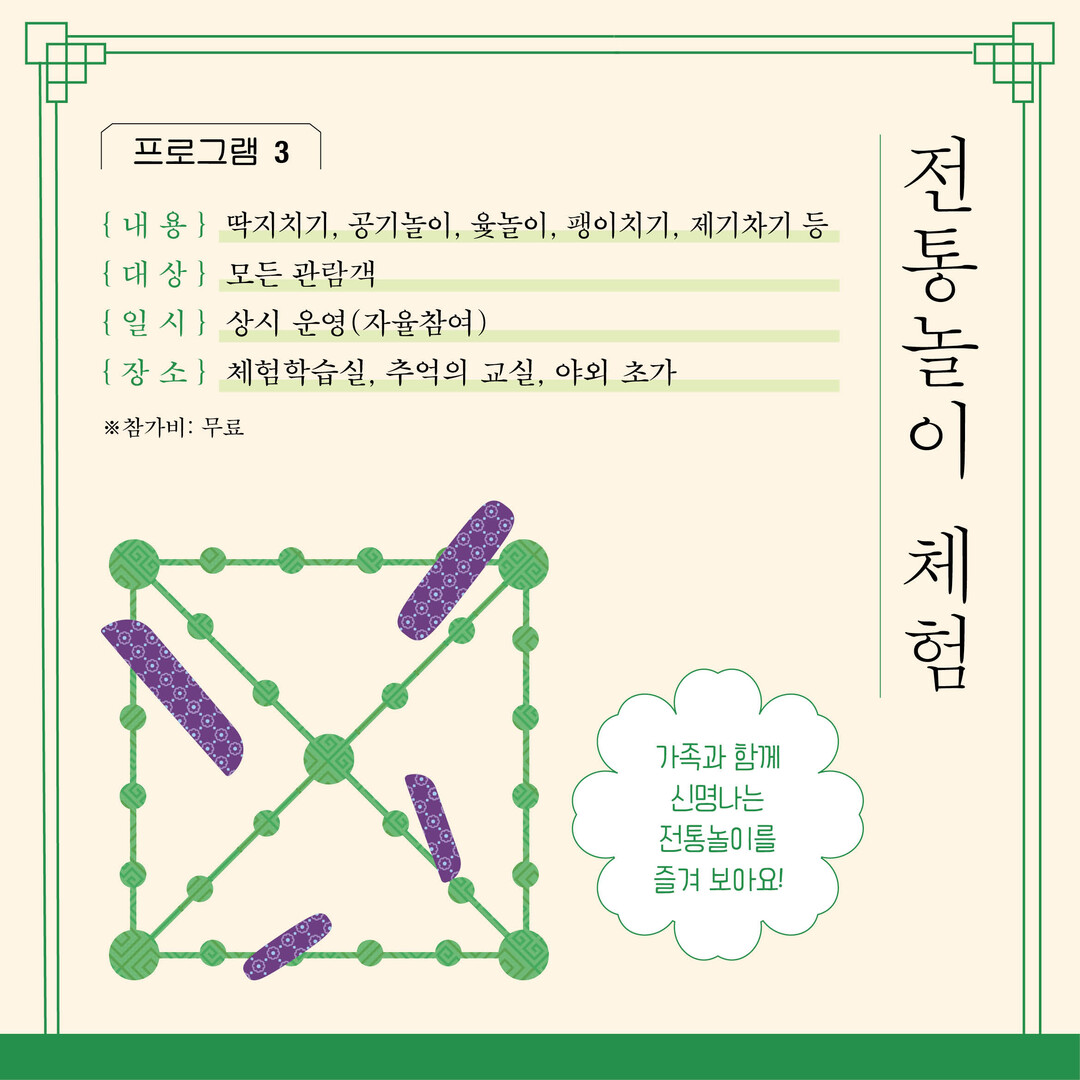 박물관 2층 체험학습실과 야외 초가에서는 딱지치기, 공기놀이, 제기차기, 투호놀이, 널뛰기 등 다양한 전통놀이가 준비되어 있다. 참가 어린이들에게는 설 연휴 가족과 함께 즐길 수 있도록 전통놀이 활동지와 조선시대 딱지 접기 세트가 제공될 예정이다.