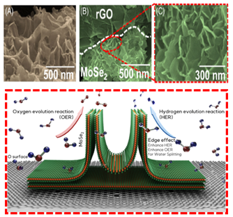 최근 한국에너지공과대학교 심욱 교수 (㈜닐사이언스 대표) 연구팀은 공유 결합된 MoSe2와 rGO로 만들어진 3차원 형태의 복합체를 합성하는데 성공하였다고 보고하였다. Janani 박사, Surendran 연구교수, 이동규 박사과정생, S. Shanmugapriya 박사가 저자로 참여한 이번 논문에서는 3 차원 형태로 합성 MoSe2/rGO 복합체는 높은 반응 활성을 가지며 물 분해에서 100 mAcm-2에 도달하기 위해 1.64 V의 낮은 셀 전압이 필요로 한다고 설명하였다. 또한 이러한 성능 향상은 MoSe2의 3D 구조와 그 사이의 계면 공유 결합에 의해 노출된 더 많은 가장자리 사이트를 가진 rGO 위에 응집된 MoSe2에 기인한다고 전했다.