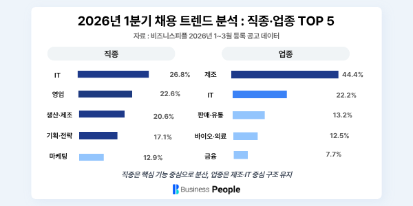 장예지 비즈니스피플 책임은 “올해 1분기 경력직 채용은 특정 직무 중심에서 벗어나 IT와 전략, 생산 등 조직 핵심 기능 전반으로 확대되는 흐름을 보였다”며 “기업들이 단기 실적보다 조직 안정성과 지속 성장 기반 확보에 무게를 두고 있다는 점이 반영된 결과”라고 말했다.