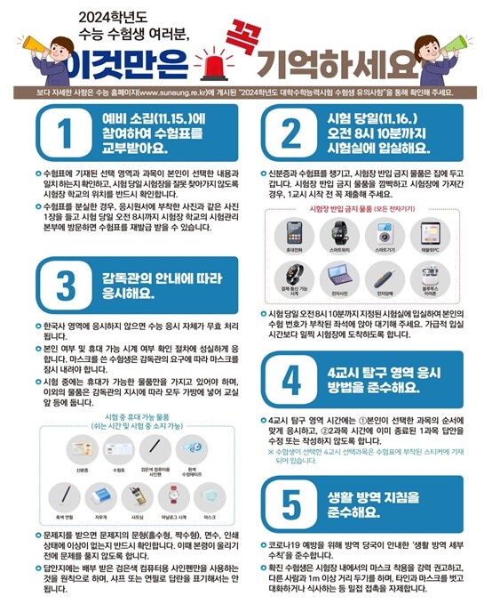 올해는 킬러문항이 배제된 수능 원년으로 교육부는 11월 16일에 실시될 2024학년도 대학수학능력시험 유의사항을 수능 홈페이지에 7일 게시했다.