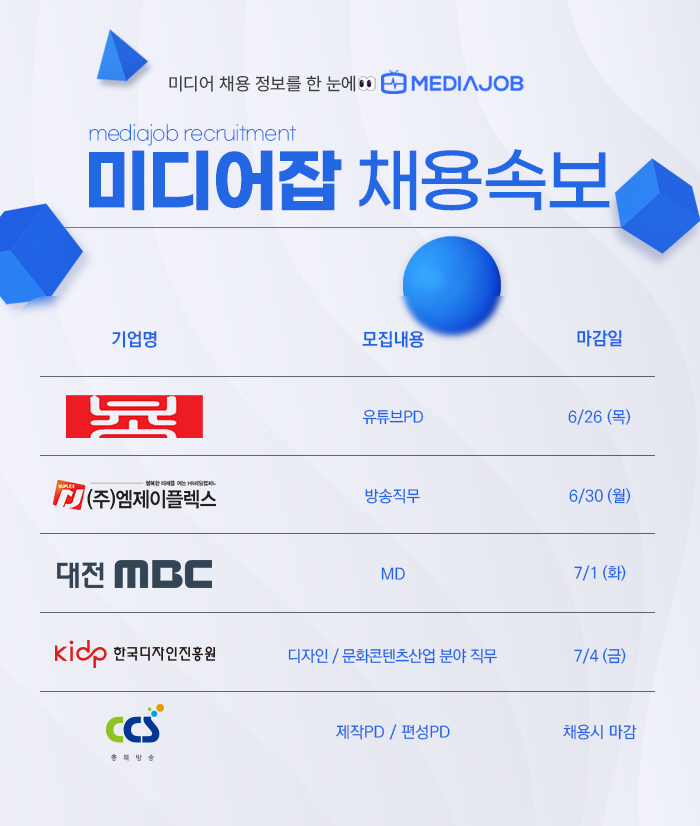[피앤피뉴스=마성배 기자] 미디어 전문 채용 플랫폼 미디어잡이 최근 업계 인기 직군의 구인 정보를 공개한 가운데, 방송 제작부터 콘텐츠 편성, 유튜브 채널 운영에 이르기까지 다양한 포지션에서 학력·경력 제한 없는 ‘열린 채용’이 진행 중이다.