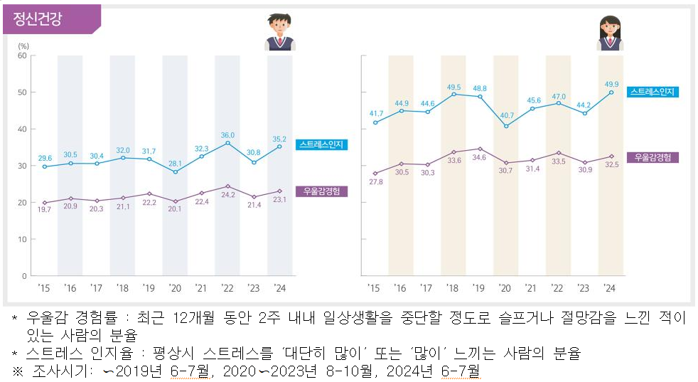 한편, 정신건강과 식생활은 개선이 시급한 과제로 지적됐다. 우울감 경험률은 남학생 23.1%, 여학생 32.5%로 전년 대비 증가했으며, 스트레스 인지율도 높은 수준을 유지하고 있다. 이 같은 정신건강 문제는 학업 스트레스와 사회적 고립감 증가와 밀접한 관련이 있다는 분석이 나온다.