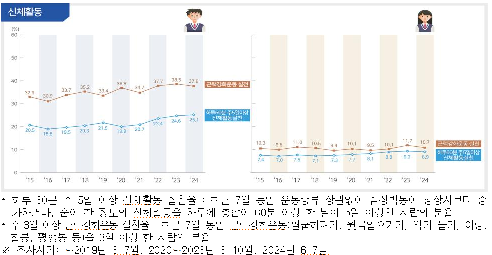특히 신체활동 실천율도 개선됐다. 남학생의 경우 25.1%, 여학생은 8.9%로 2009년 대비 각각 9.4%포인트, 3.5%포인트 증가했다. 이러한 변화는 학교와 지역사회가 함께 추진한 건강증진 프로그램의 효과로 분석된다.