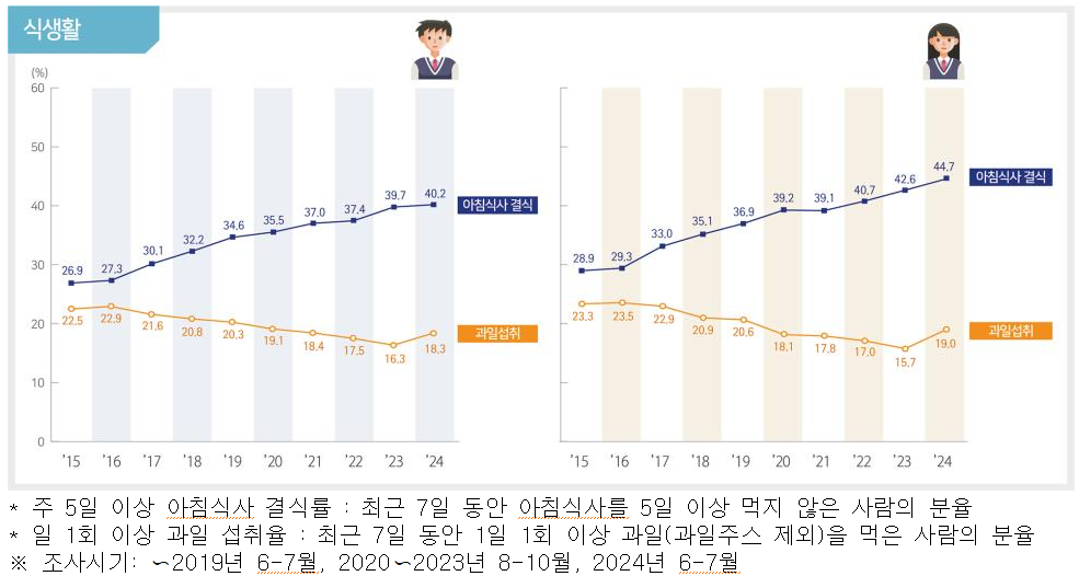 식생활 부문에서는 아침 결식률이 여학생 44.7%, 남학생 40.2%로 꾸준히 상승하고 있으며, 패스트푸드 섭취율 또한 증가세를 보였다. 특히 여학생의 경우 식사량 조절이나 다이어트로 인해 영양 불균형이 심화되는 것으로 나타났다.